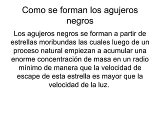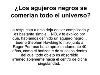 Los agujeros negros se forman a partir de estrellas moribundas con grandes cantidades de masa concentrada en un pequeño radio, creando una gravedad tan fuerte que nada puede escapar, incluida la luz. Aunque los agujeros negros absorben todo lo que entra en su horizonte de sucesos, no consumirían todo el universo porque su crecimiento se detendría. Se han propuesto varias teorías especulativas sobre los agujeros negros, como que podrían ser puertas a otros universos o medios de teletransporte.