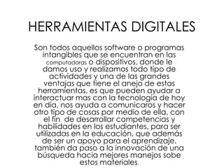 Las herramientas digitales incluyen programas y software que se pueden usar en computadoras y dispositivos para realizar varias actividades. Estas herramientas pueden ayudar a interactuar con la tecnología moderna y comunicarse, y se pueden usar en la educación para desarrollar habilidades en los estudiantes. Algunos usos comunes de las herramientas digitales son la comunicación, la educación, la investigación y el manejo de documentos.