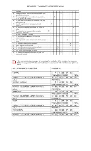 El documento presenta los resultados de Yeison Arango Ríos, estudiante de grado 11, en una rueda de la vida y un test de 30 preguntas sobre 5 áreas de su desarrollo personal: mental, social y familiar, financiera, física y profesional. Yeison obtuvo los siguientes puntajes totales en cada área: 220 en lo mental, 350 en lo social y familiar, 300 en lo financiero, 280 en lo físico y 250 en lo profesional. En la gráfica de barras se muestran visualmente los resultados.