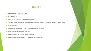 Este documento resume los resultados de aprendizaje de Yeison Alexander Rubio en 2019. Incluye ensamblar y desensamblar equipos, instalar sistemas operativos, medir tiempos de instalación entre DVD y USB, soldadura, limpieza de equipos, múltiplos y submúltiplos, y corriente alterna y directa.