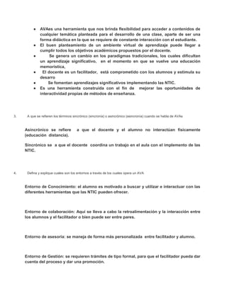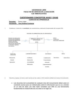 Este documento presenta las respuestas de un estudiante a un cuestionario sobre conceptos de Ambientes Virtuales de Aprendizaje (AVAs) y Objetos Virtuales de Aprendizaje (OVAs). El estudiante define AVAs y OVAs, describe sus características y usos, y proporciona ejemplos de cada uno. También explica conceptos como sincrónico, asincrónico y los entornos en los que operan los AVAs.