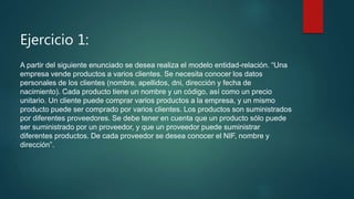 Una empresa vende productos a clientes. Los clientes compran productos y los productos son suministrados por proveedores. Se requiere modelar las entidades y relaciones entre clientes, productos y proveedores.