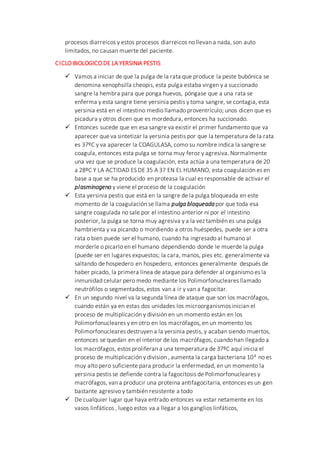Este documento resume información sobre bacterias como Yersinia pestis y Pasteurella multocida. Yersinia pestis causa la peste bubónica y se transmite a humanos a través de pulgas infectadas. Pasteurella multocida puede causar infecciones después de mordidas de perros o gatos. El documento describe los síntomas, diagnóstico y tratamiento de estas enfermedades, así como el ciclo de vida de Yersinia pestis dentro del cuerpo.