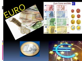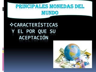 Este documento presenta información sobre las características y aceptación de cuatro monedas: el dólar estadounidense, el euro, la libra esterlina y el yen japonés. Describe las características físicas y de diseño de cada moneda, así como los factores que han contribuido a su amplia aceptación en los mercados financieros internacionales.