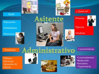 Este documento presenta un perfil de trabajo que incluye la educación, habilidades, destrezas y funciones de un puesto. Ofrece servicios de atención al cliente utilizando conocimientos de redacción, iniciativa y experiencia para procesar y analizar información.