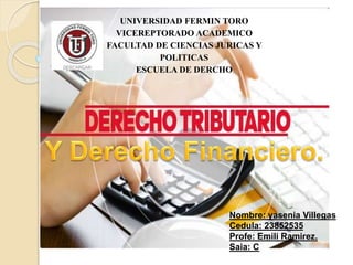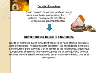 El documento describe las diferentes ramas del derecho financiero y tributario. Explica que el derecho financiero se ocupa de regular los ingresos y gastos públicos, mientras que el derecho tributario regula las imposiciones tributarias. También discute los principios de legalidad, justicia, igualdad y no confiscatoriedad que rigen estos derechos.