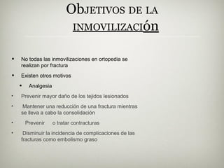 La inmovilización en ortopedia no solo se utiliza para fracturas, sino también para analgesia y prevención de complicaciones. Los yesos y férulas son esenciales en la inmovilización, detallando tipos, principios de colocación, y cuidados post-aplicación para garantizar la buena circulación y evitar complicaciones. Se destacan diferentes tipos de yesos y férulas, dependiendo del segmento a inmovilizar, y se enfatiza la importancia del control radiológico tras su colocación.