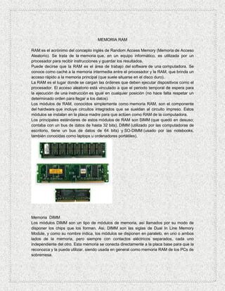 La RAM es la memoria utilizada por el procesador para recibir instrucciones y guardar resultados de forma temporal. A lo largo de los años se han desarrollado diferentes estándares de módulos de RAM como SIMM, DIMM, RIMM y DDR, DDR2 y DDR3, cada uno con mejoras en capacidad, velocidad y rendimiento. Los módulos DIMM se impusieron como estándar al permitir el doble de capacidad y trabajar con 64 bits en lugar de los 32 bits de SIMM. Posteriormente aparecieron RIMM, DDR, D