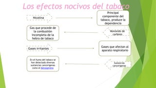 El documento describe los efectos nocivos del tabaco, incluyendo la nicotina y varios gases y sustancias cancerígenas encontrados en el humo del tabaco. También describe a la Organización Mundial de la Salud (OMS) como una agencia de las Naciones Unidas fundada en 1948 cuyo objetivo es promover la salud a nivel mundial y sus funciones como participar en reuniones internacionales y transmitir información a las autoridades españolas.