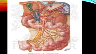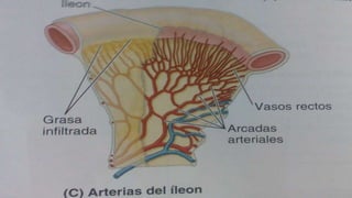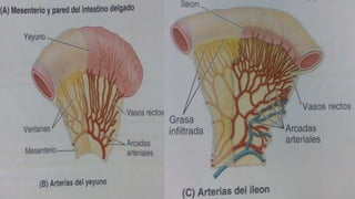 El documento describe la anatomía y funciones del yeyuno y el íleon, incluyendo su irrigación arterial, drenaje venoso y linfático, e inervación. Se destacan características como el color, diámetro y grosor de las paredes de ambos segmentos del intestino delgado, así como sus funciones en la absorción de nutrientes. Además, se detalla la anatomía del mesenterio que conecta estas dos partes del intestino.
