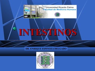 El documento describe la anatomía del intestino delgado y el colon. El intestino delgado se extiende desde el duodeno hasta el ciego y está dividido en yeyuno y ileon. El colon comienza en el ciego y termina en el recto. El documento detalla la estructura, relaciones, vascularización e inervación de estas regiones del tracto gastrointestinal.