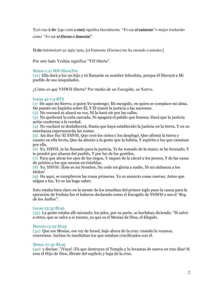 El documento discute la relación entre YHWH y Yeshúa según la Biblia. Señala que la Biblia no enseña la doctrina de la doble naturaleza de Cristo, sino que Yeshúa es el Hijo de Dios en el sentido de ser el escogido y siervo de YHWH. Citas bíblicas muestran que "Hijo de Dios" se refiere al Mesías y no implica divinidad. También afirma que YHWH y Yeshúa no son la misma persona y que Yeshúa tiene a YHWH como su