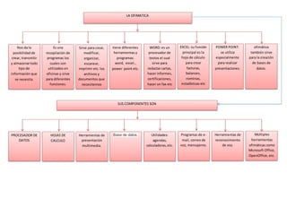 La ofimática nos permite crear, almacenar y transmitir información a través de programas como Word, Excel y PowerPoint. Word es un procesador de textos para redactar documentos, Excel es una hoja de cálculo para crear facturas y estadísticas, y PowerPoint se usa para presentaciones. La ofimática también incluye herramientas para bases de datos, correo electrónico, procesamiento de datos y hojas de cálculo.