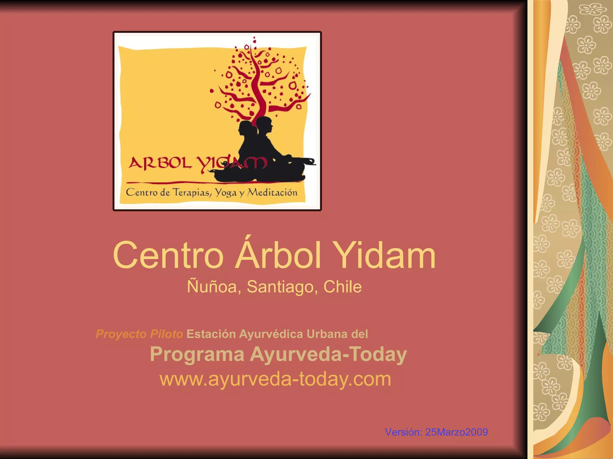El documento describe un proyecto piloto para establecer un centro ayurvédico urbano en Santiago, Chile. El centro ofrecerá varias terapias ayurvédicas como masajes con aceites, terapia de vapor y consultas médicas en un ambiente relajado y familiar. El centro contará con salas para consultas, terapias, yoga, clases y espera. El proyecto también incluye un jardín para cultivar plantas medicinales y una tienda minorista de productos ayurvédicos.