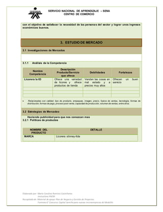El documento presenta un plan de negocio para una licorera llamada "Licorera Stinney-LTDA" en la cumbre. El plan incluye una descripción general del proyecto, un estudio de mercado con análisis de la competencia, estrategias de mercadeo, proyecciones de ventas y un estudio técnico que concluye que el negocio es factible. El objetivo es satisfacer las necesidades de la comunidad ofreciendo licores de buena calidad, buen servicio y precios accesibles.