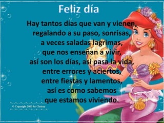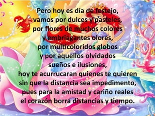 Este poema de cumpleaños desea a Yadira un día feliz rodeada de amigos y familiares que la quieren. Reconoce que aunque no puedan estar físicamente presentes, la llevan en sus corazones. Le agradece por los buenos momentos compartidos y por enseñarle a ver la vida con una sonrisa a pesar de los altibajos. Le desea lo mejor y que siempre pueda contar con su amistad sincera.