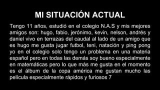 Carlos Horacio Gómez Nieto es un estudiante de 11 años del colegio N.A.S. Le gusta jugar fútbol, tenis, natación y ping pong. Tiene buenas calificaciones en todas las materias excepto español. Su sueño es estudiar ingeniería industrial en la Universidad de los Andes o Harvard, trabajar por dos años en la compañía de su papá y luego vivir en los Estados Unidos.