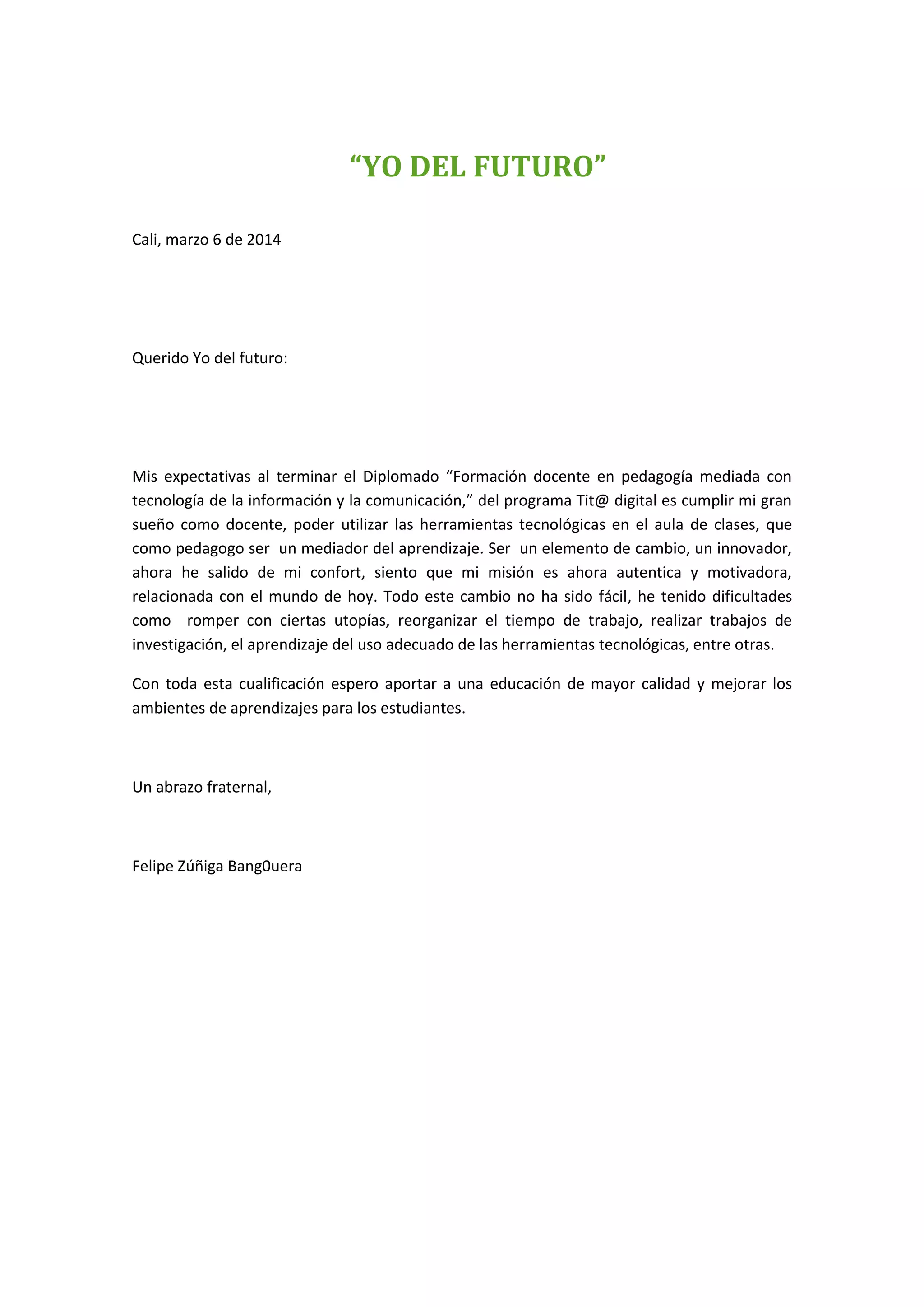 Este documento es una carta escrita por Felipe Zúñiga Bang0uera a su yo del futuro después de completar un diplomado en pedagogía mediada con tecnología de la información y la comunicación. Felipe expresa su deseo de utilizar herramientas tecnológicas en el aula para ser un elemento de cambio e innovador relacionado con el mundo actual. Aunque el proceso ha sido difícil, rompiendo utopías y reorganizando su tiempo, Felipe espera que su nueva cualificación le permita aportar una educación de mayor calidad y mejor