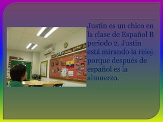 El relato narra las acciones de Justin, un estudiante de español que está ansioso por ir a almorzar. Cuando llega a la cafetería, se enoja porque las filas son muy largas y tiene mucha hambre. Recuerda que la profesora de español tiene chocolate en su escritorio, por lo que se escabulle en el salón de clases para robar el chocolate mientras la maestra no está. Justin logra robar el chocolate y huye contento para comérselo sin compartir.