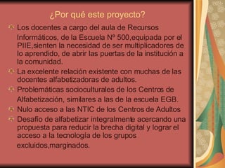 El proyecto 'Yo puedo, vos podés' busca alfabetizar integralmente a adultos en Villa Constitución mediante el uso de NTIC, reduciendo la brecha digital y fortaleciendo la autoestima y la justicia social. Se fomenta la colaboración entre docentes y alumnos de varios centros de alfabetización, promoviendo el desarrollo de habilidades de pensamiento y la socialización de experiencias educativas. A través de herramientas informáticas, se espera impulsar la reflexión y acción en la comunidad, mejorando los modos de vida de los participantes.