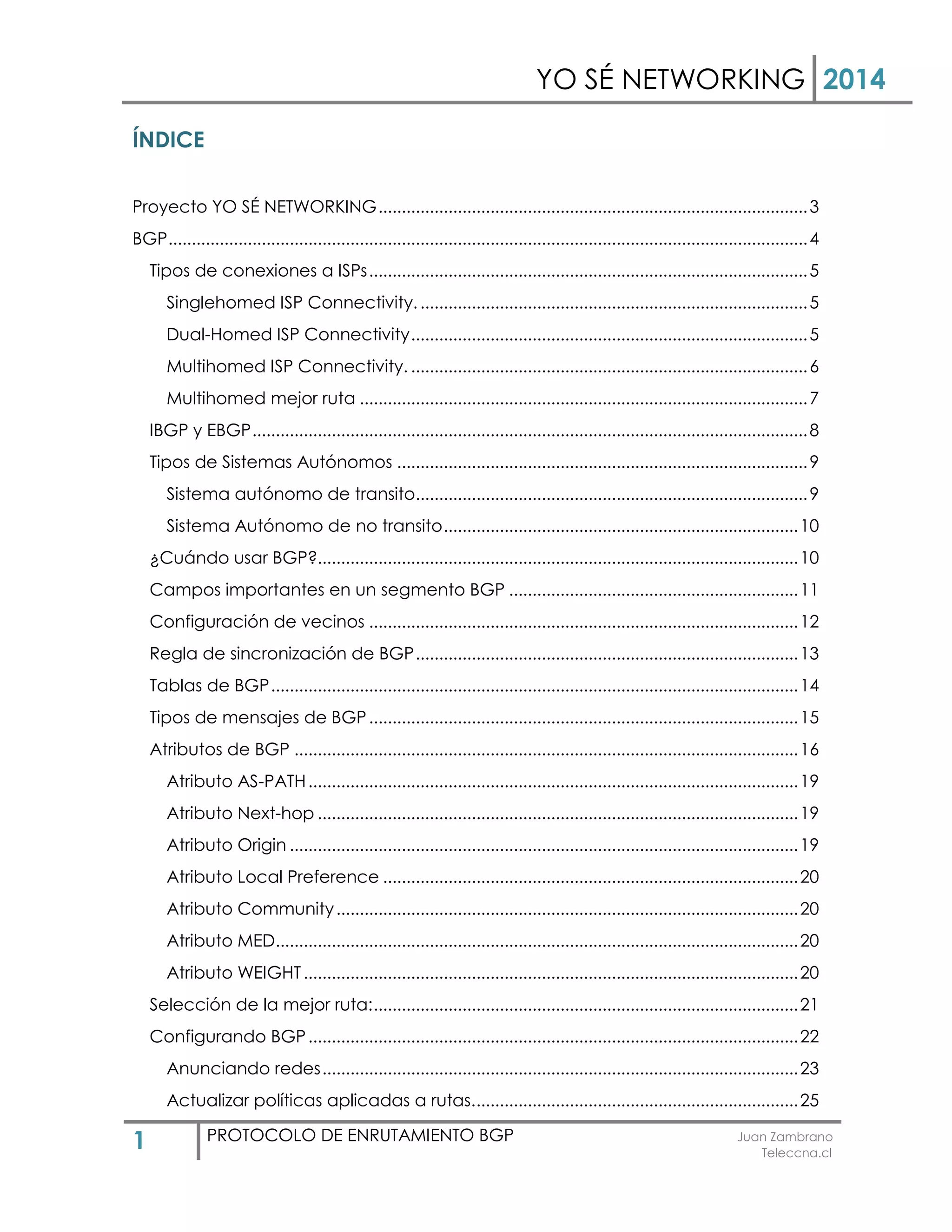 1) El documento habla sobre el protocolo de enrutamiento BGP y cómo es utilizado por los ISPs para interconectar sistemas autónomos. 2) Explica los tipos de conexión a ISPs como singlehomed, dual-homed y multihomed. 3) Describe conceptos clave de BGP como IBGP, EBGP y los diferentes tipos de sistemas autónomos.
