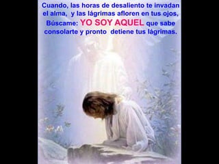 El texto es un mensaje introspectivo y espiritual que presenta a Jesús como consuelo, fuerza, refugio, paciencia, balsamo, sinceridad, alegría, esperanza, perdón, fe y renuncia en momentos de dificultad. Invoca la necesidad de buscarlo en situaciones de desánimo y desesperanza para encontrar apoyo y comprensión en la vida. Se concluye con la afirmación de Jesús como la esencia de la naturaleza y un remedio para las aflicciones humanas.