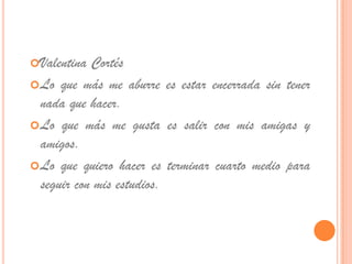 Valentina tiene 18 años y vive con su madre, abuelo, prima y su hijo. Le aburre estar encerrada sin nada que hacer y le gusta salir con amigos. Quiere terminar cuarto medio para seguir estudiando una carrera profesional.