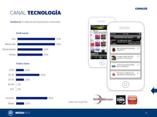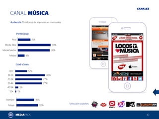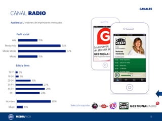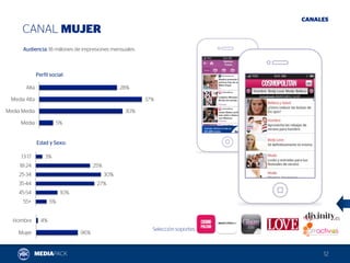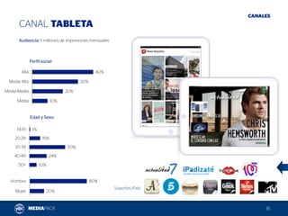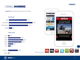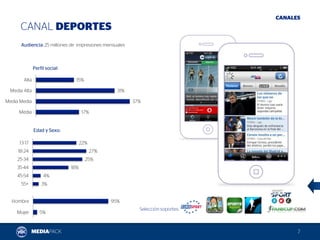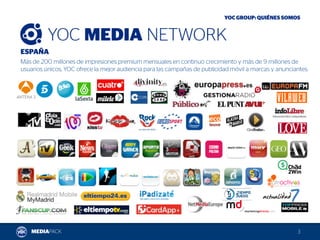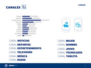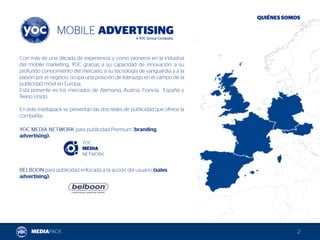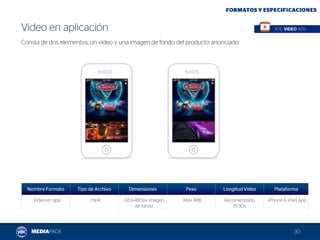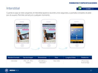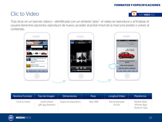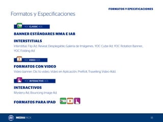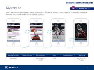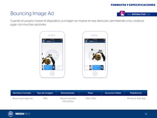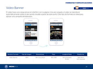 El documento describe un anuncio dinámico en forma de cubo giratorio que se integra en contenido editorial. Este anuncio permite la adaptación de diversos elementos creativos para campañas publicitarias, incluyendo la optimización de sitios web móviles y landing pages. Además, se mencionan acciones especiales como passbook que pueden ser desarrolladas para los clientes.