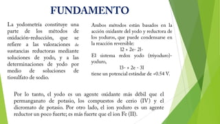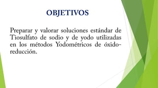 El documento describe los procesos para preparar soluciones de tiosulfato de sodio 0.1N y yodo 0.1N, y estandarizar estas soluciones a través de titulaciones yodométricas. Incluye los pasos para pesar y disolver los reactivos, transferir las soluciones a matraces aforados, y titular con buretas hasta cambios de color para determinar las normalidades.