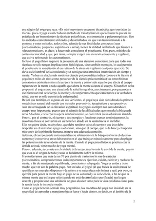 Este documento presenta una introducción al yoga. Explica que el yoga es un método espiritual originario de la India de más de 6,000 años de antigüedad que se ha vuelto popular en Occidente. Describe que el yoga incluye técnicas físicas, mentales y energéticas para el auto-perfeccionamiento, bienestar integral y evolución de la conciencia. También destaca que el yoga puede beneficiar la salud física y mental, y que sus técnicas se han utilizado en diversos contextos como escuelas, cár