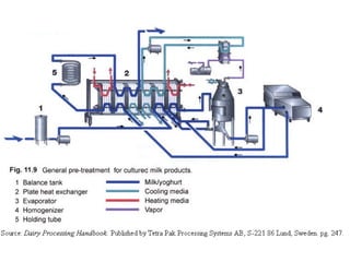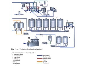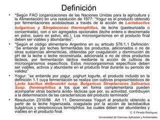 El documento define el yogur según la FAO y el código alimentario argentino. Según la FAO, el yogur se obtiene por la fermentación ácida de la leche a través de Lactobacillus bulgaricus y Streptococcus thermophilus. El código alimentario argentino también requiere que estos microorganismos sean viables y abundantes en el producto final. La materia prima principal es la leche, la cual puede ser entera o descremada. El documento también menciona que analizará las características físico-