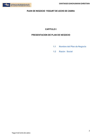 Este documento presenta un plan de negocio para la producción y comercialización de yogurt de leche de cabra. Propone elaborar un yogurt frutado con pulpa de frutas de la región para ofrecer un producto saludable y diferenciado de la competencia. Realiza un análisis de mercado que muestra una demanda potencial del 87% y concluye que el producto tendrá buena aceptación debido a que cubriría una necesidad actualmente no satisfecha.