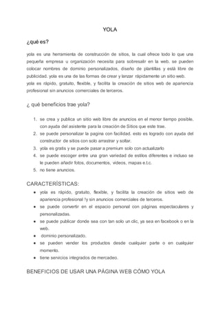 Yola es una herramienta gratuita para crear sitios web profesionales sin anuncios de forma rápida y sencilla. Ofrece plantillas de diseño, dominios personalizados y un asistente para crear sitios que permite a los usuarios construir y publicar páginas web libres de anuncios en poco tiempo y de manera flexible.