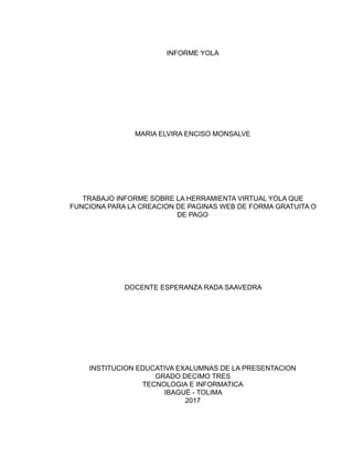 Este documento resume las características y funcionalidades de la herramienta Yola, una plataforma en línea gratuita que permite crear sitios web de forma sencilla. Explica que Yola fue fundada en 2007 en Sudáfrica y actualmente ofrece plantillas y herramientas para crear páginas web profesionales sin necesidad de conocimientos de código. Además, proporciona servicios pagos con más almacenamiento, dominios personalizados y otras ventajas. Finalmente, detalla el proceso paso a paso para crear un