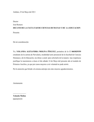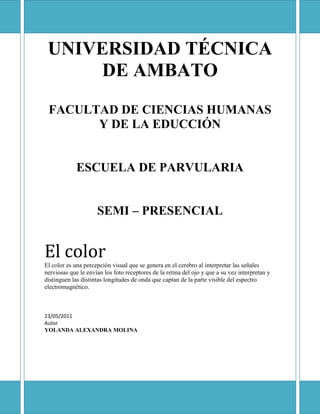 El documento habla sobre el color y cómo se percibe en el cerebro. Explica que el color se genera a partir de las señales nerviosas que envían los fotorreceptores de la retina al interpretar las diferentes longitudes de onda de la luz visible. También incluye una carta de una estudiante solicitando la justificación de su inasistencia a una clase.