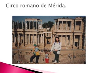 El documento describe el Circo Romano de Mérida, uno de los mayores edificios de espectáculos de la ciudad construido en el siglo I d.C. durante el imperio de Tiberio. Con más de 400 metros de longitud y 115 metros de anchura, el Circo podía albergar a 30.000 espectadores y contaba con una pista central y una espina decorada donde se realizaban carreras de cuadrigas. A día de hoy, el Circo de Mérida es el único que conserva toda su planta original, declarado Patrimonio de la Humanidad