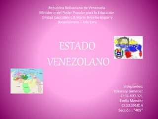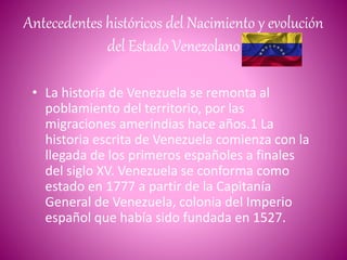 El documento resume la historia del estado venezolano desde la época precolombina hasta la actualidad. Se divide en varias etapas clave: la época precolombina, la época colonial bajo dominio español, la independencia de Venezuela, la formación de Gran Colombia, el caudillismo y la guerra federal, el guzmancismo, la hegemonía andina, la dictadura de Pérez Jiménez, el retorno a la democracia, el fin del bipartidismo y la llegada de Hugo Chávez al poder con la Revolución Bolivariana