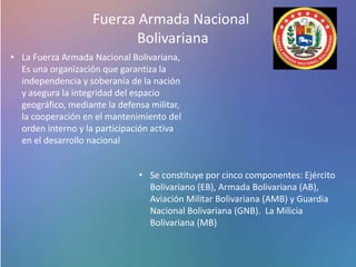 El documento describe la organización y funciones de la Fuerza Armada Nacional Bolivariana de Venezuela. Está compuesta por cinco componentes principales (Ejército, Armada, Aviación, Guardia Nacional y Milicia) y tiene como misión garantizar la independencia y soberanía de Venezuela mediante la defensa militar y el mantenimiento del orden interno. Cada componente tiene roles específicos como proteger las fronteras terrestres, asegurar la soberanía en aguas territoriales, resguardar el espacio aéreo y colaborar con la policía.