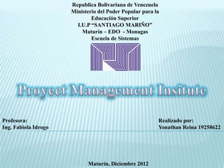 El documento es un informe de la Escuela de Sistemas de la Universidad "Santiago Mariño" en Maturín, Venezuela. Resume los detalles de un proyecto realizado por el estudiante Yonathan Reina bajo la supervisión de la profesora Ing. Fabiola Idrogo en diciembre de 2012.