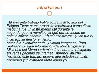 El documento describe la máquina Enigma, un dispositivo criptográfico inventado en 1919 que fue utilizado por Alemania durante la Segunda Guerra Mundial para cifrar mensajes de radio. La máquina Enigma consistía en un teclado, un modificador rotativo que codificaba las letras, y un tablero de luces que mostraba la letra codificada. Aunque los alemanes creían que su código era indescifrable, los británicos eventualmente pudieron romperlo usando máquinas como la bomba y la computadora Colossus, desarroll