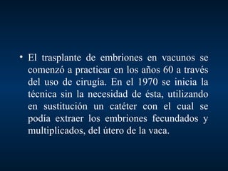 El documento trata sobre la biotecnología pecuaria, en particular la técnica de trasplante de embriones. Resume que en los años 60 se comenzó a practicar el trasplante de embriones bovinos mediante cirugía, pero en los 70 se desarrolló una técnica no quirúrgica que utiliza un catéter. Explica los beneficios de esta técnica como mejorar la descendencia genética y maximizar el uso de material seminal de alto valor.