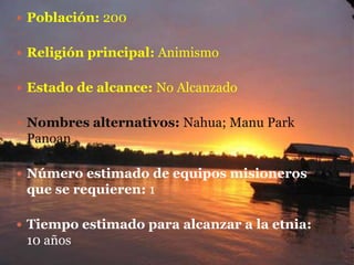 Esta tribu de 200 personas vive en aislamiento en la selva peruana cerca de los ríos Panagua y Mishagua. Son animistas y hablan el idioma yora. Se ganan la vida vendiendo madera, cultivando y cazando. Se necesita un equipo misionero para pasar 10 años evangelizando a la tribu y traduciendo la Biblia a su idioma, con el fin de que conozcan el evangelio y se liberen de sus creencias animistas.