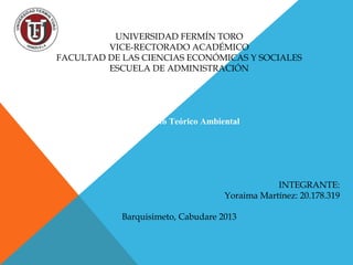 El documento habla sobre conceptos fundamentales relacionados con el ambiente como ecología, biosfera, radiación solar y energía. Menciona la Universidad Fermín Toro, la Facultad de Ciencias Económicas y Sociales y la Escuela de Administración. También incluye los datos de la autora Yoraima Martínez.