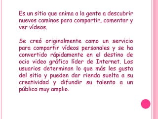 YouTube es un sitio web creado en 2005 que permite a usuarios cargar, ver y compartir videos de forma gratuita. Se ha convertido en la principal plataforma de entretenimiento de video en internet, donde los usuarios pueden expresar su creatividad y talento para una audiencia global.