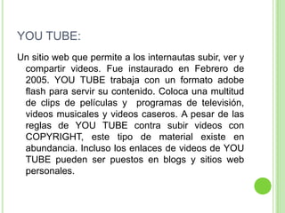 YouTube es un sitio web que permite a los usuarios subir, ver y compartir videos. Los usuarios pueden subir videos propios o clips de películas y programas de televisión. Aunque YouTube prohíbe el contenido con derechos de autor, este tipo de material se encuentra ampliamente disponible. Los usuarios pueden organizar sus videos favoritos, editar su perfil y configuración de cuenta, y publicar videos propios en YouTube.