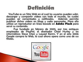 YouTube es un sitio web creado en 2005 que permite a los usuarios subir, compartir y comentar videos. Los usuarios pueden publicar videos en formato Flash, añadirles etiquetas y compartirlos a través de enlaces. En 2006, YouTube fue adquirido por Google y ahora opera como una de sus filiales.