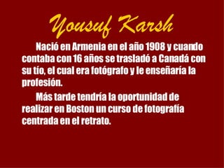 Yousuf Karsh nació en Armenia en 1908 y se trasladó a Canadá a los 16 años para aprender fotografía de su tío. Más tarde estudió retrato en Boston y abrió su propio estudio en Ottawa, donde fotografió a figuras importantes de la política, el espectáculo y la ciencia. Algunos de sus sujetos más famosos incluyen a Anna Magnani, Ernest Hemingway, Fidel Castro, Joan Crawford, la familia real británica y Winston Churchill.