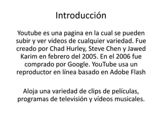 YouTube es un sitio web para compartir videos creado en 2005. Fue comprado por Google en 2006. Los usuarios pueden subir y ver una variedad de videos como clips de películas, programas de TV y música. YouTube creció rápidamente y atrajo inversiones importantes.