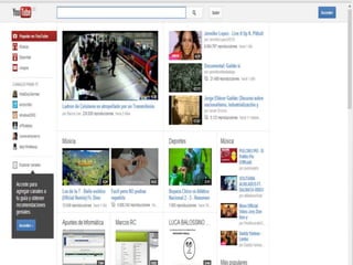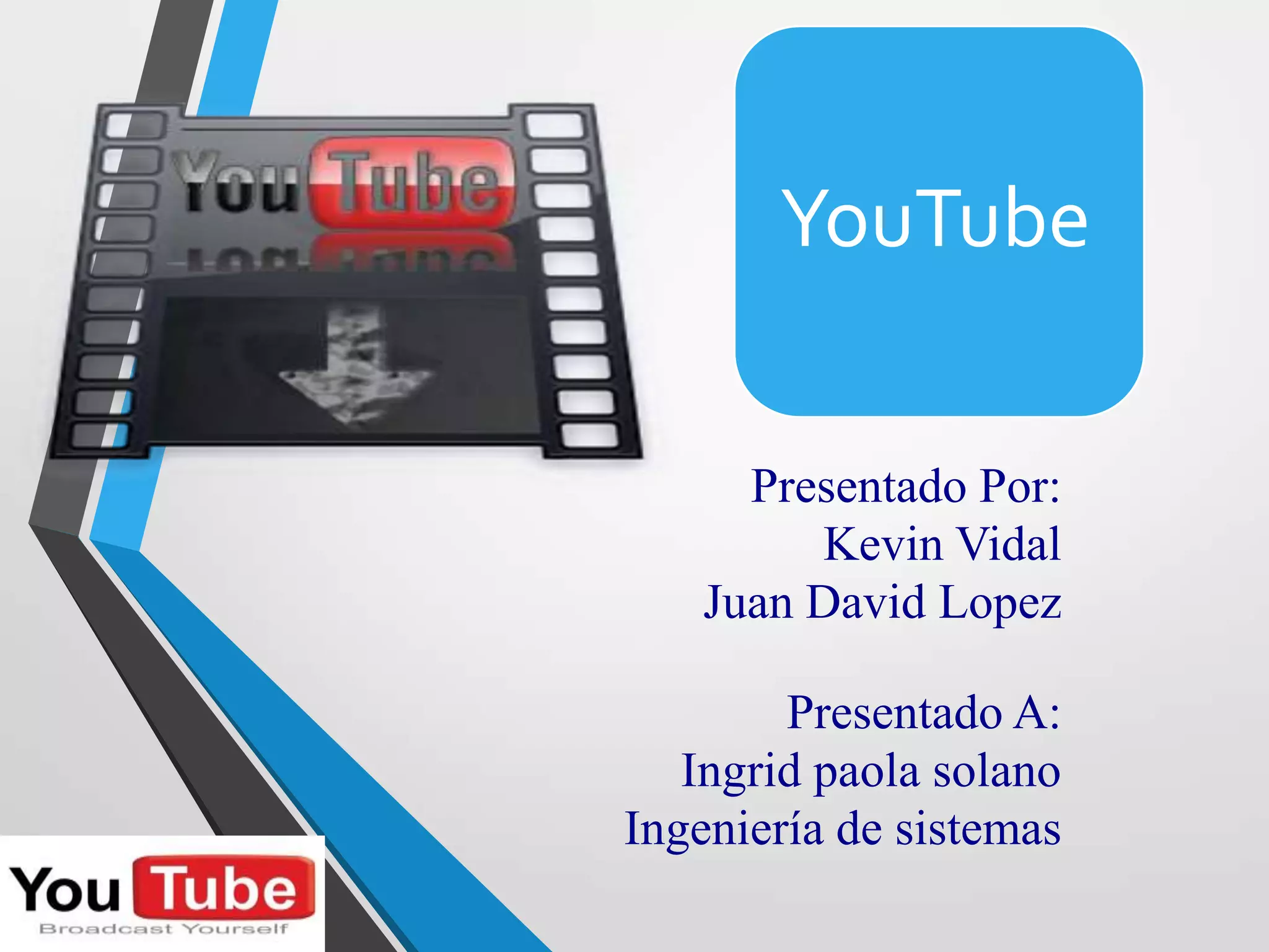 Un repositorio es un sitio centralizado donde se almacena y mantiene información digital como bases de datos o archivos. YouTube es un sitio web gratuito para subir y compartir videos cortos que fue fundado en 2005 y comprado por Google en 2006. Los usuarios pueden crear canales, subir, editar y descargar videos usando diversos formatos.