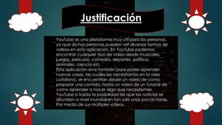 YouTube es una plataforma muy útil para ver diversos tipos de videos educativos y de entretenimiento. Fue creada en 2005 por Chad Hurley, Steve Chen y Jawed Karim. Actualmente es propiedad de Google, que la compró en 2006. YouTube permite a usuarios comunes y empresas publicar y compartir videos de forma gratuita.